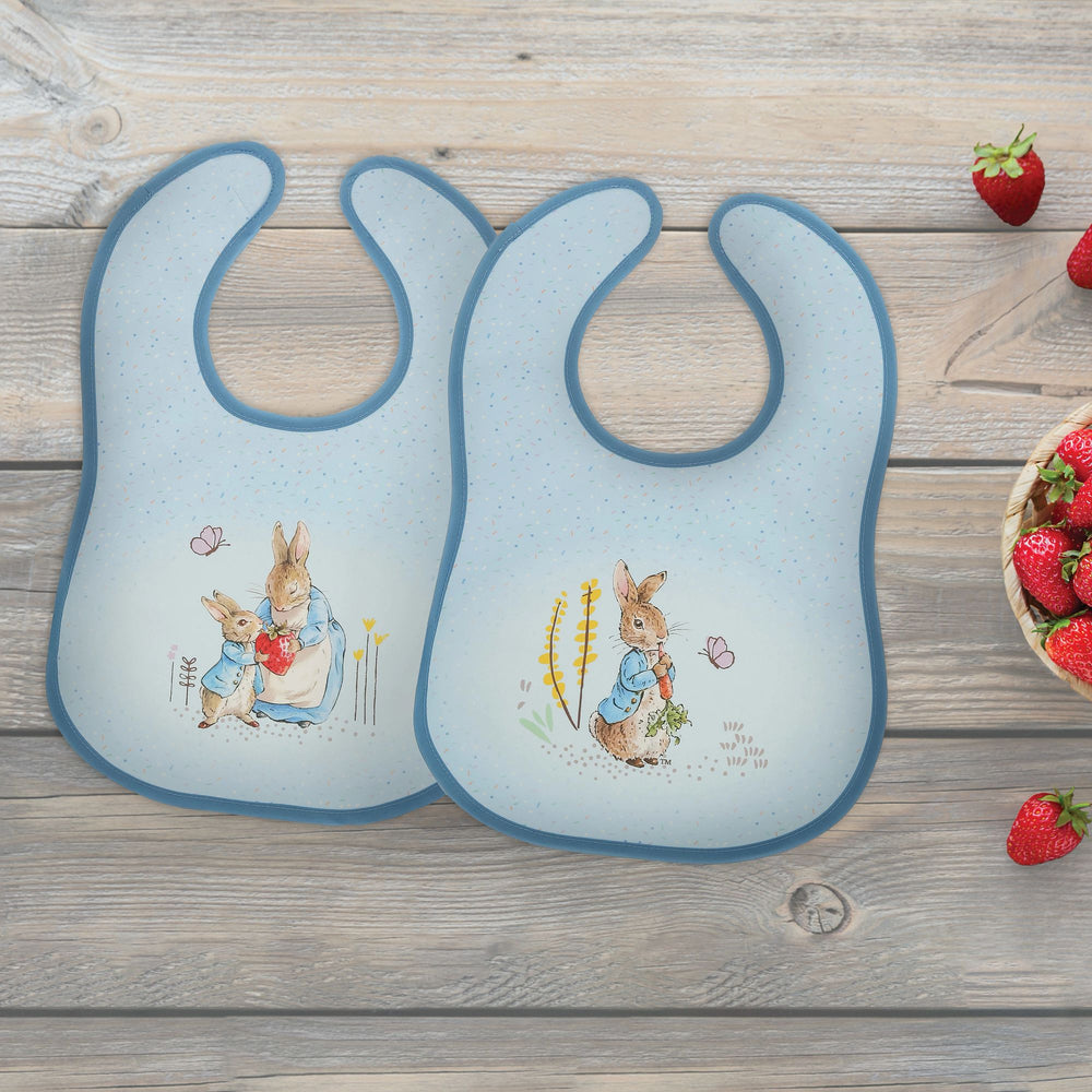 Introducing the delightful Peter Rabbit Bib Set, inspired by the charming tales of Peter Rabbit and friends. This enchanting set of two bibs ensures mealtime is both stylish and mess-free. Crafted with super-soft, wipeable fabric, each bib features an easy Velcro fastening for quick changes. Adorned with whimsical illustrations, these bibs are perfect for little ones. The set comes elegantly presented with a branded gift hanger and hangtag, making it an ideal gift for any occasion. Make every meal a magical adventure with Peter Rabbit.