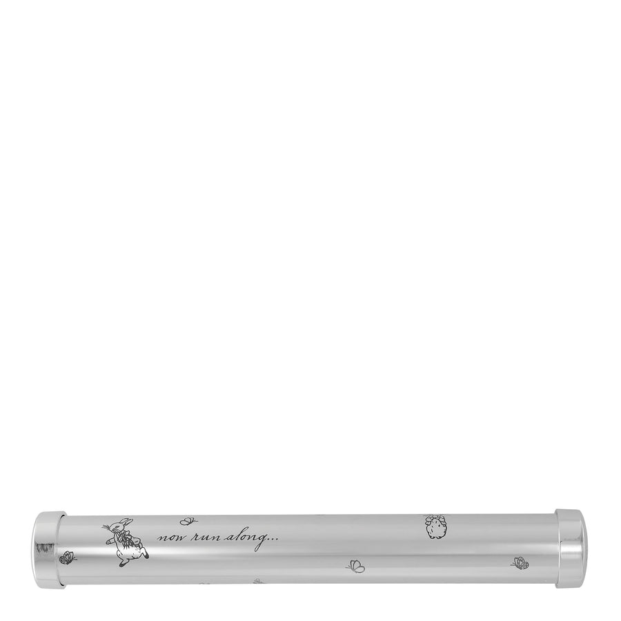 Celebrate a new bundle of joy with the Beatrix Potter New Baby collection. The silver-plated Certificate Holder, with an adorable etched illustration of Peter Rabbit, is the perfect keepsake piece for storing a birth certificate or other important documents that will be treasured for years to come. The engraved text reads "Now rung along... and don't get into mischief". Delivered in a branded Beatrix Potter gift box making it the perfect present for new parents, for a baby shower or Christening.