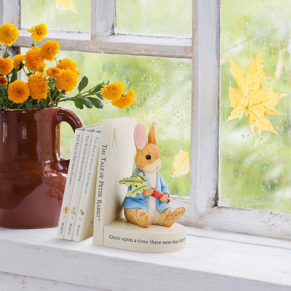 An ornamental Peter Rabbit bookend, designed with the famous Tale of Peter Rabbit book in mind. An ideal accessory for the living room, home office or home library space. This book stop makes the ideal collector's piece or gift. Presented in a branded box. The artwork for each product is taken from redrawn illustrations helping to bring the featured character to life. Material: cast stone.